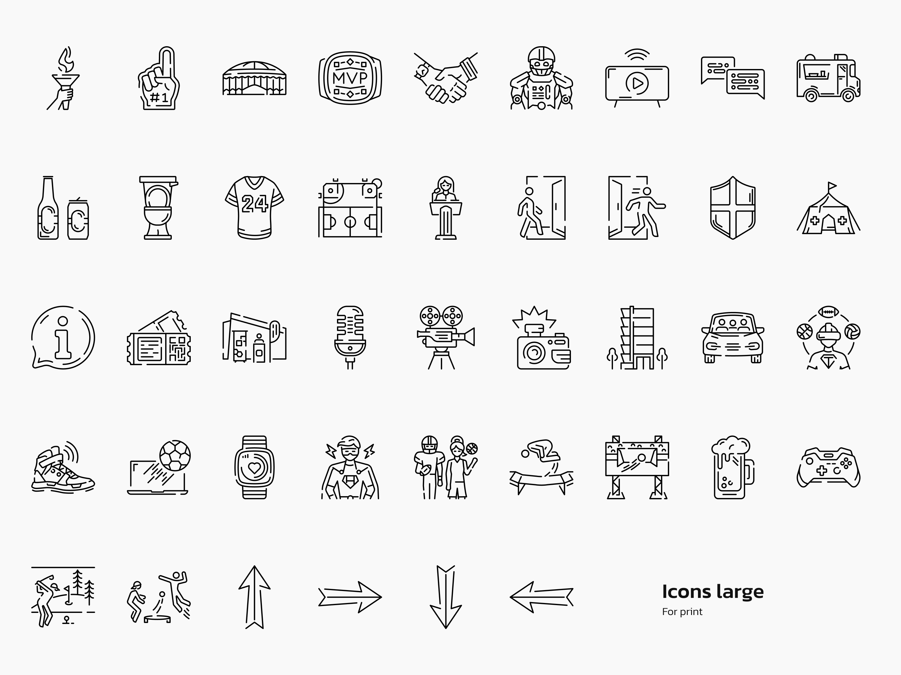 The first set comprises large, detailed icons tailored for use in printed materials and signage, ensuring clarity and precision in larger formats. The second set features smaller, simplified icons specifically optimized to function seamlessly at 36 pixels.